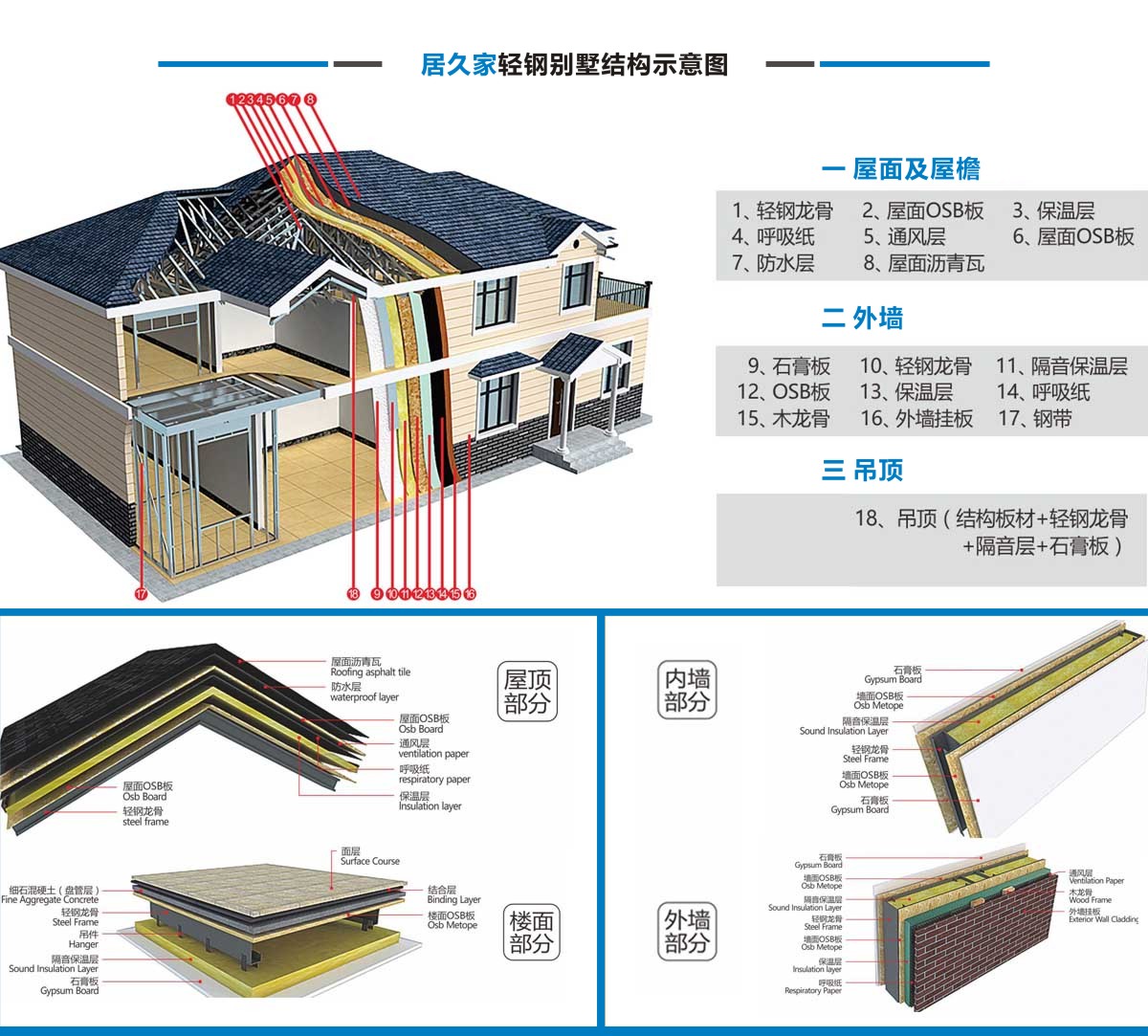 居久家輕鋼別墅隸屬于四川萬建城建筑工程有限公司,集科研、設計、咨詢、加工、生產安裝為一體。一直致力于新型輕鋼結構房屋的研究、開發和應用,倡導房屋建筑的設計和應用在標準化、模塊化、通用化、規?;a的同時,實現人居環境的個性化、人性化、以及健康和舒適。 公司目前引進具有國內先進水平輕鋼結構房屋建筑技術和生產線,標準化、精細化和定制化設計、制造、安裝輕鋼結構房屋。不僅能夠提供風格各異的別墅建筑,同樣能夠提供行業標準的輕鋼樓宇建筑及建筑群。居久家裝配式房屋技術體系是高效節能型綠色建筑體系,各項建筑物理性能卓越,處于業內先進水平,能夠為客戶提供全程模塊化綠色建筑集成解決方案。